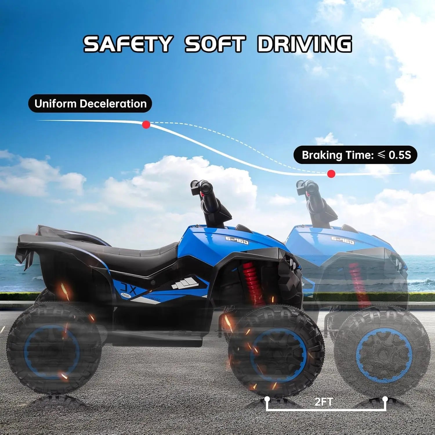 【All-Terrain Capability with Safety Focus】 Equipped with wear-resistant treaded tires that grip multiple surfaces including grass, sand, pavement, and gravel. The low-center gravity design and wide wheelbase provide stability, while the automatic braking system (≤0.5s response time) ensures controlled stops.