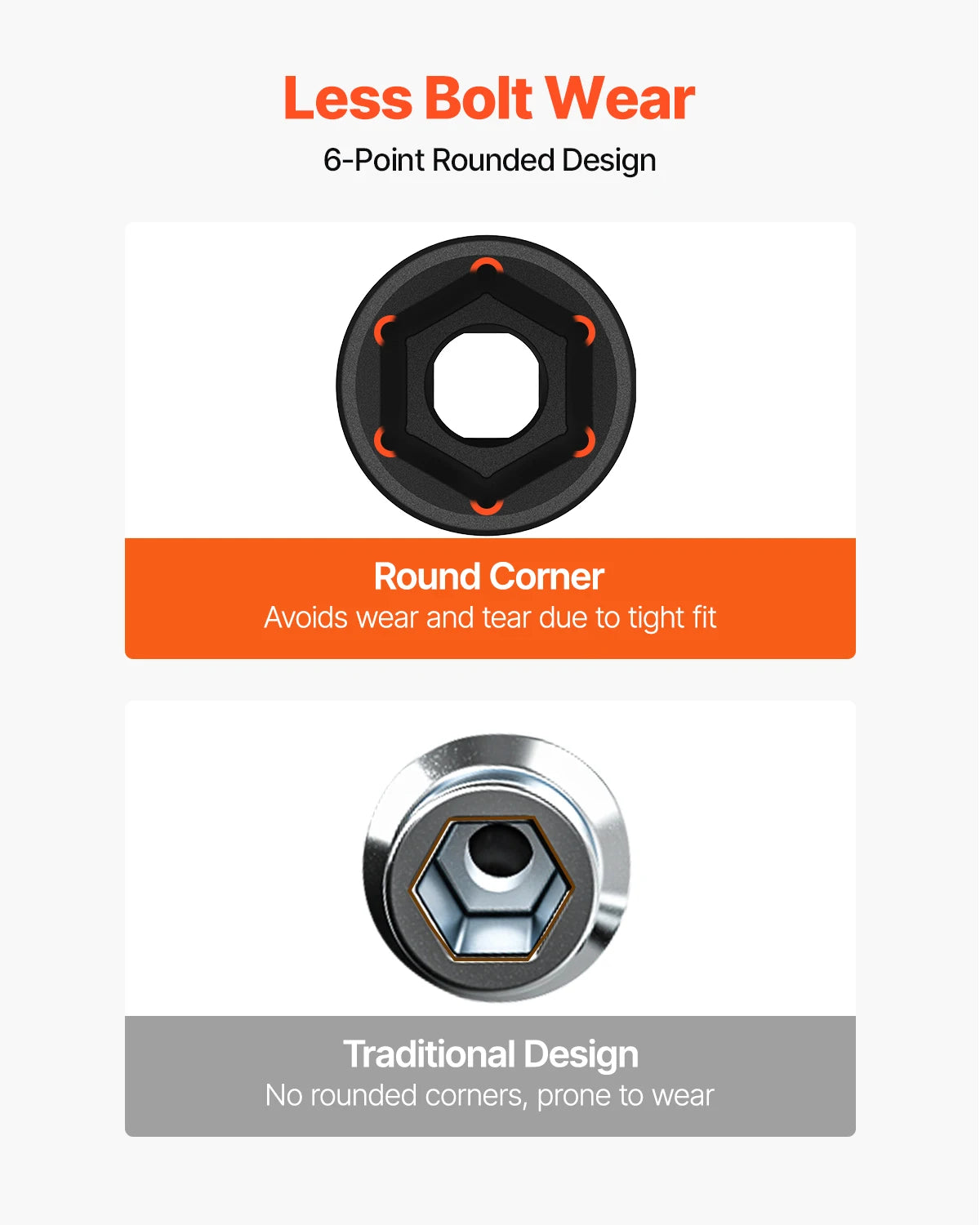 【SUPERIOR PERFORMANCE】- Whether you drive them with an impact wrench or by hand, these premium chrome vanadium sockets deliver superior performance. The impact socket set features a 6-point, high-torque design that contacts and grips the stronger flat sides of the nut or bolt head, not the weaker corners.